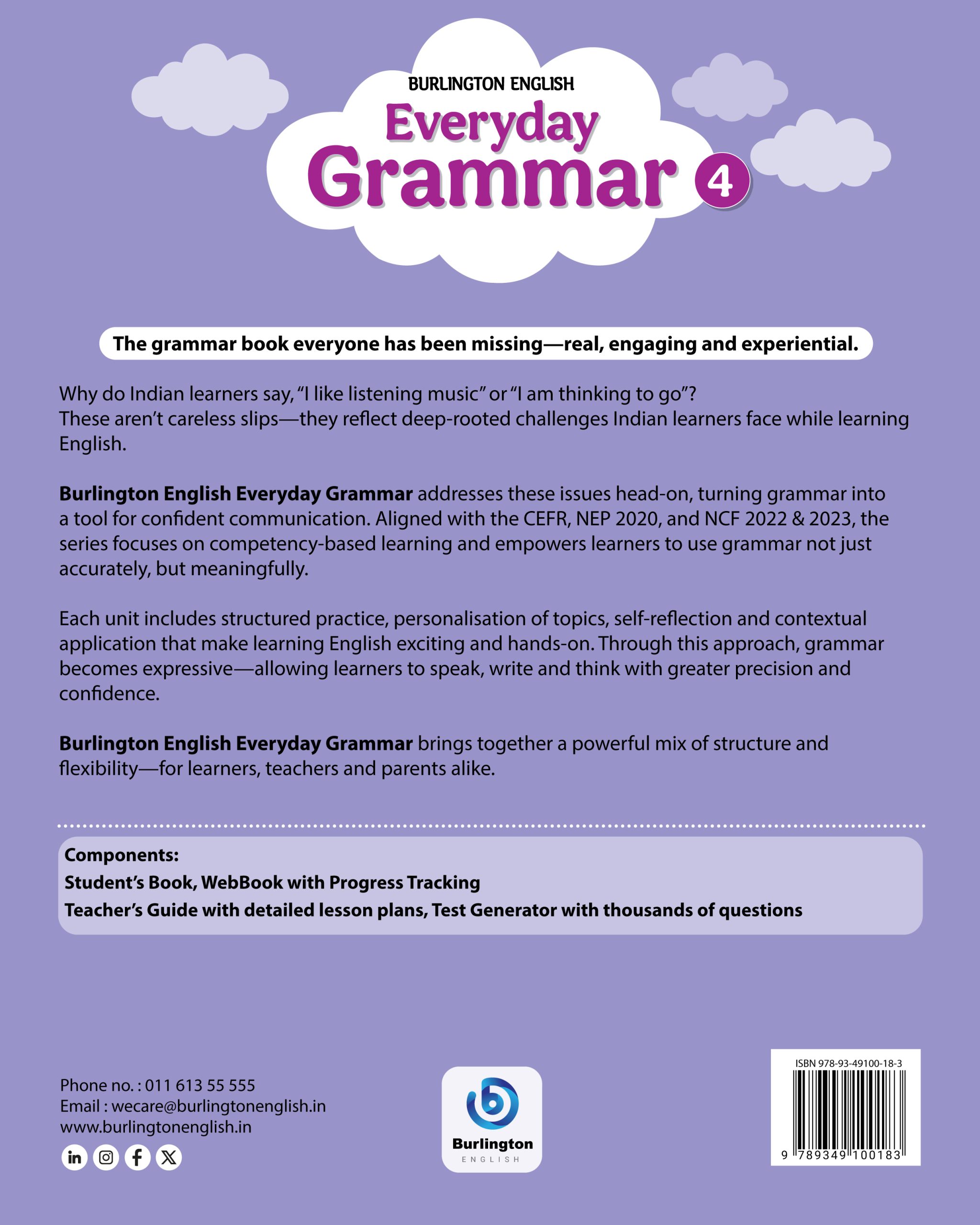 Burlington English Everyday Grammar addresses these issues head-on, turning grammar into a tool for confident communication. Aligned with the CEFR, NEP 2020, and NCF 2022 & 2023, the series focuses on competency-based learning and empowers learners to use grammar not just accurately, but meaningfully.